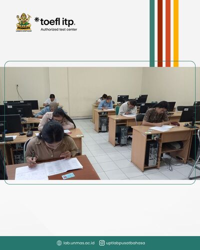 Pelaksanaan Tes TOEFL ITP Periode 8 Januari 2026 diselenggarakan oleh UPT. Laboratorium dan Pusat Bahasa Unmas Denpasar yang diikuti oleh Peserta Mahasiswa Unmas Denpasar dan umum.